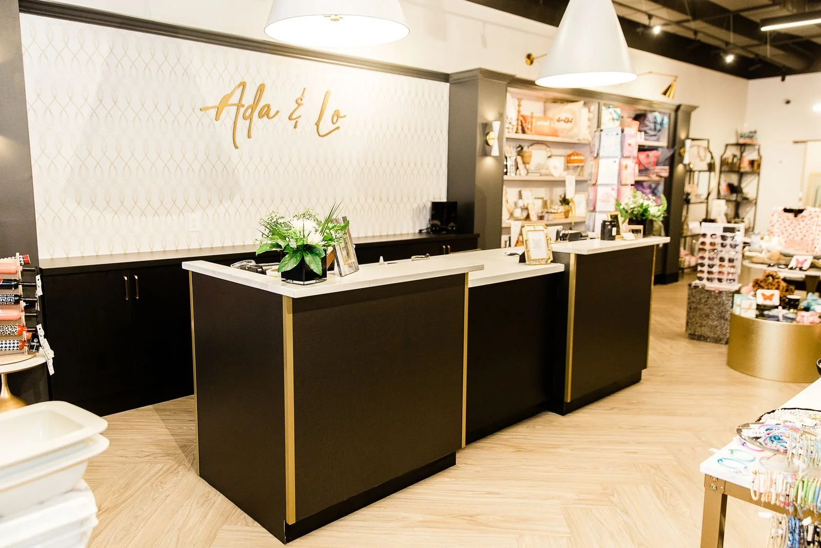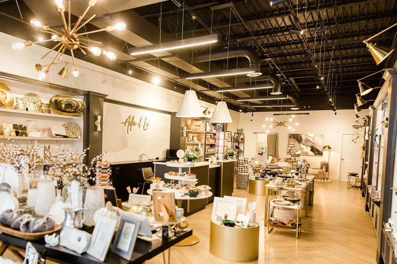 We set out to design a retail experience unlike anything else in Lexington. With bold black and gold accents, layers of decorative lighting, and custom casework crafted for one-of-a-kind displays, ADA & Lo feels elevated, glamorous, and unmistakably unique. Every detail was curated to create a shopping environment that stands apart—inviting, memorable, and designed to reflect the individuality of the brand.